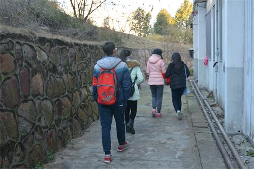 图为宿管会成员在宿舍楼后侧巡逻