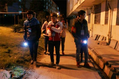 图为宿管会成员在宿舍楼栋间巡逻